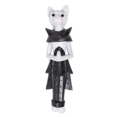 Wood Sculpture of a White Cat in Ancient Thai Dress