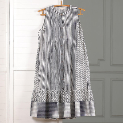 Patterned Blue and White 100% Cotton Sleeveless Tunic Dress