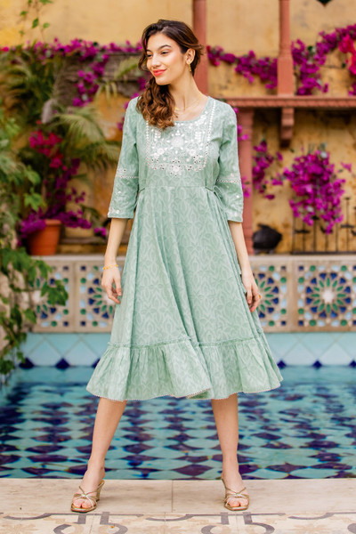 Hand-Embroidered Cotton Wrap Dress with Floral Motif
